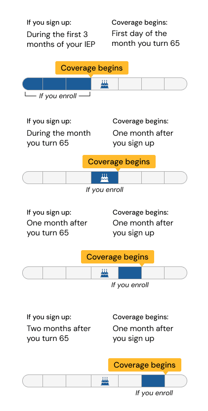 Initial Enrollment Period (IEP). This is the seven-month window when first-time enrollees can sign up for Medicare. Your individual IEP starts three months before you turn 65, and lasts for three months after the end of your month of birth. For example, if your 65th birthday is October 20, your IEP starts July 1 and ends January 31. During the IEP, you will choose whether to enroll in Part A and/or B, a prescription drug plan or a Medicare Advantage plan. The start of your coverage depends on when you enroll: